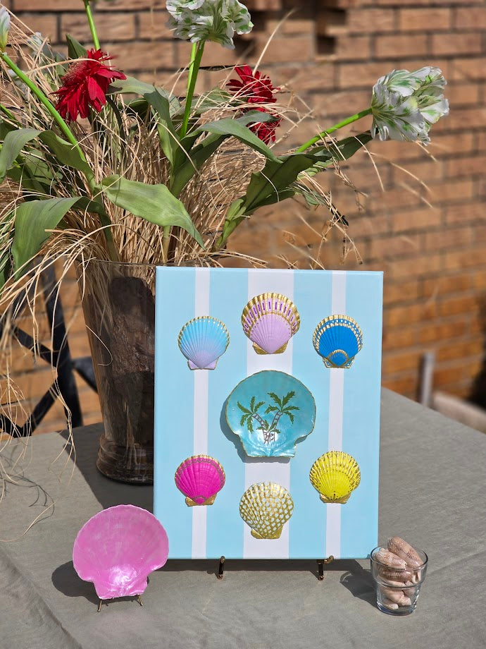 This beauty is ready for the fun! The pale blue and white striped canvas sets off the gold accented shells. The centerpiece is a large blue shell with a painting of three palm trees. All hand painted!