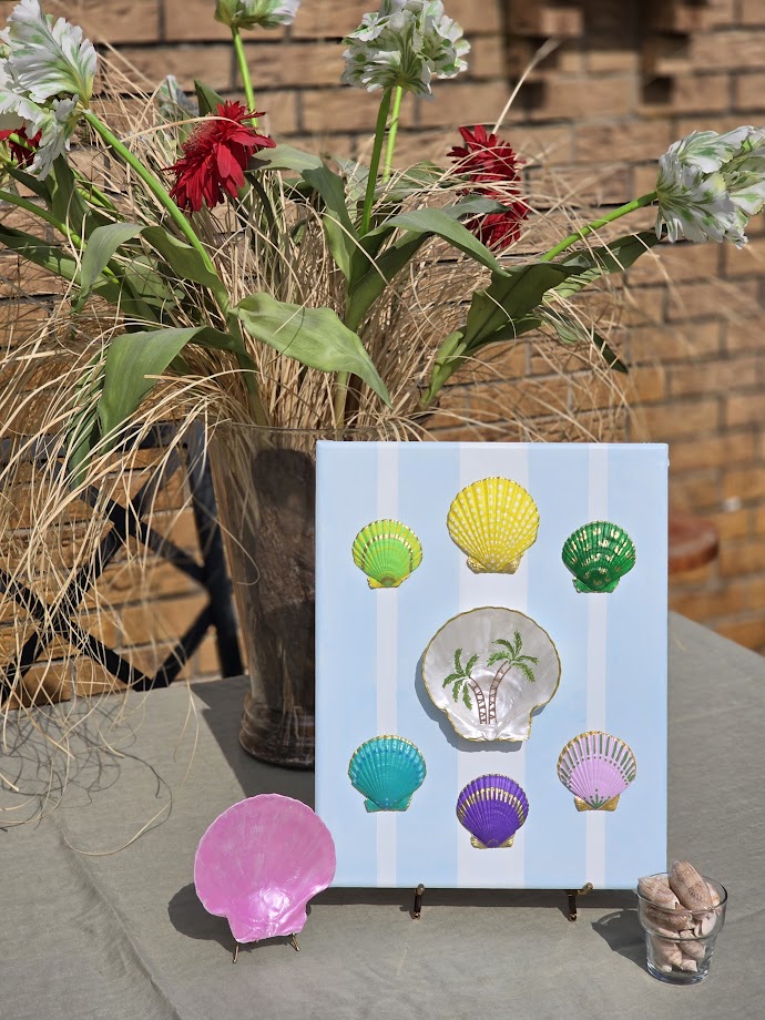 This beauty is ready for the fun! The pale blue and white striped canvas sets off the gold accented shells. The centerpiece is a large pearly white shell with a painting of two palm trees. All hand painted!