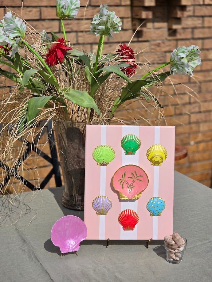 This beauty is ready for the fun! The peach and white striped canvas sets off the gold accented shells. The centerpiece is a large peach shell with a painting of three palm trees. All hand painted!
